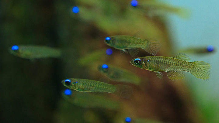 透明で青く光る目を持ち群れになると奇麗な魚。