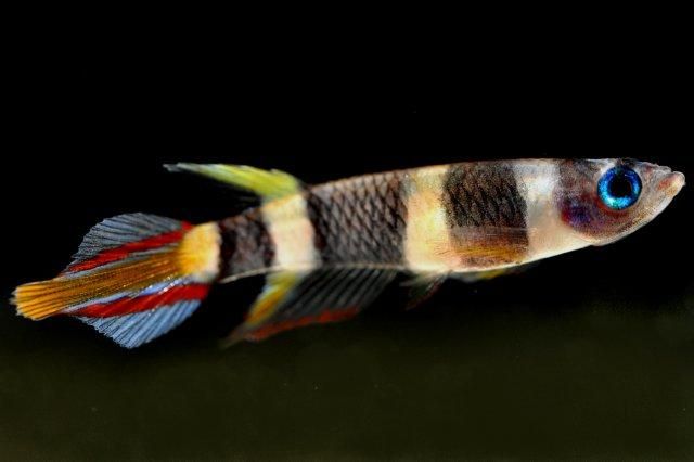 これも青い眼玉をもつ魚、道路工事のような模様を持つ。